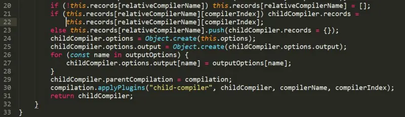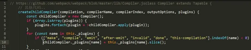 这里我们来仔细看一下子编译器是如何创建的, Compiler 实例通过 createChildCompiler 的方法来创建: