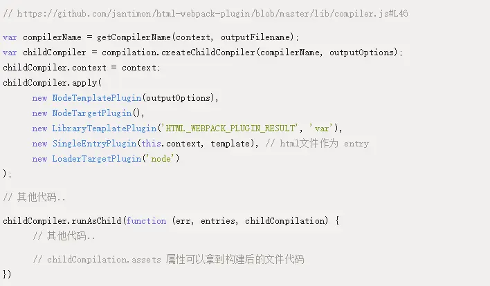 createChildCompiler 方法可以创建子编译器实例 childCompiler,创建时 childCompiler 会复制