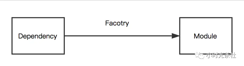 这个公式的解读是: 一个依赖对象(Dependency)经过对应的工厂对象(Factory)创建之后,就能够生成对应的模块实例(Module)。