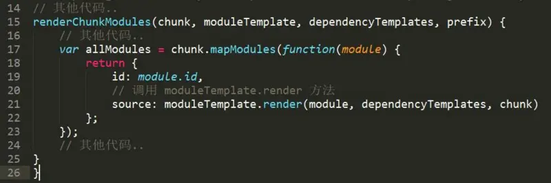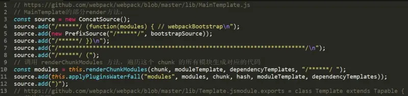 两个类的 render 方法将生成不同的"包装代码", MainTemplate 对应的入口 chunk 需要带有 webpack 的启动代码,所以会有一些函数的声明和启动。 这两个类都只负责这些"包装代码"的生成,包装代码中间的每个模块代码,是通过调用 renderChunkModules 方法来生成的。这里的 renderChunkModules 是由他们的基类 Template 类提供,方法会遍历 chunk 中的模块,然后使用 ModuleTemplate 来渲染。