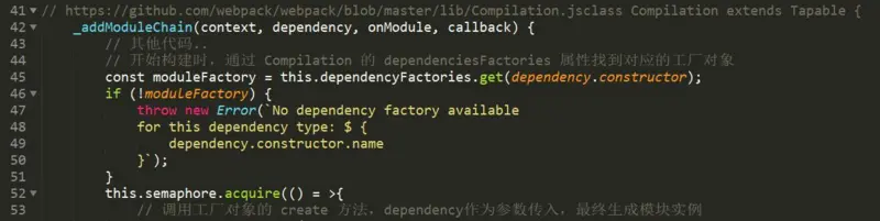 有了 Dependency 之后,如何找到对应的工厂对象呢? Dependecy 的每一个派生类在使用前,都会先确定对应的工厂对象,比如 SingleEntryDependency 对应的工厂对象是 NormalModuleFactory。这些信息全部是记录在 Compilation 对象的 dependencyFactories 属性中,这个属性是 ES6 中的 Map 对象。直接看下面的代码可能更容易理解: