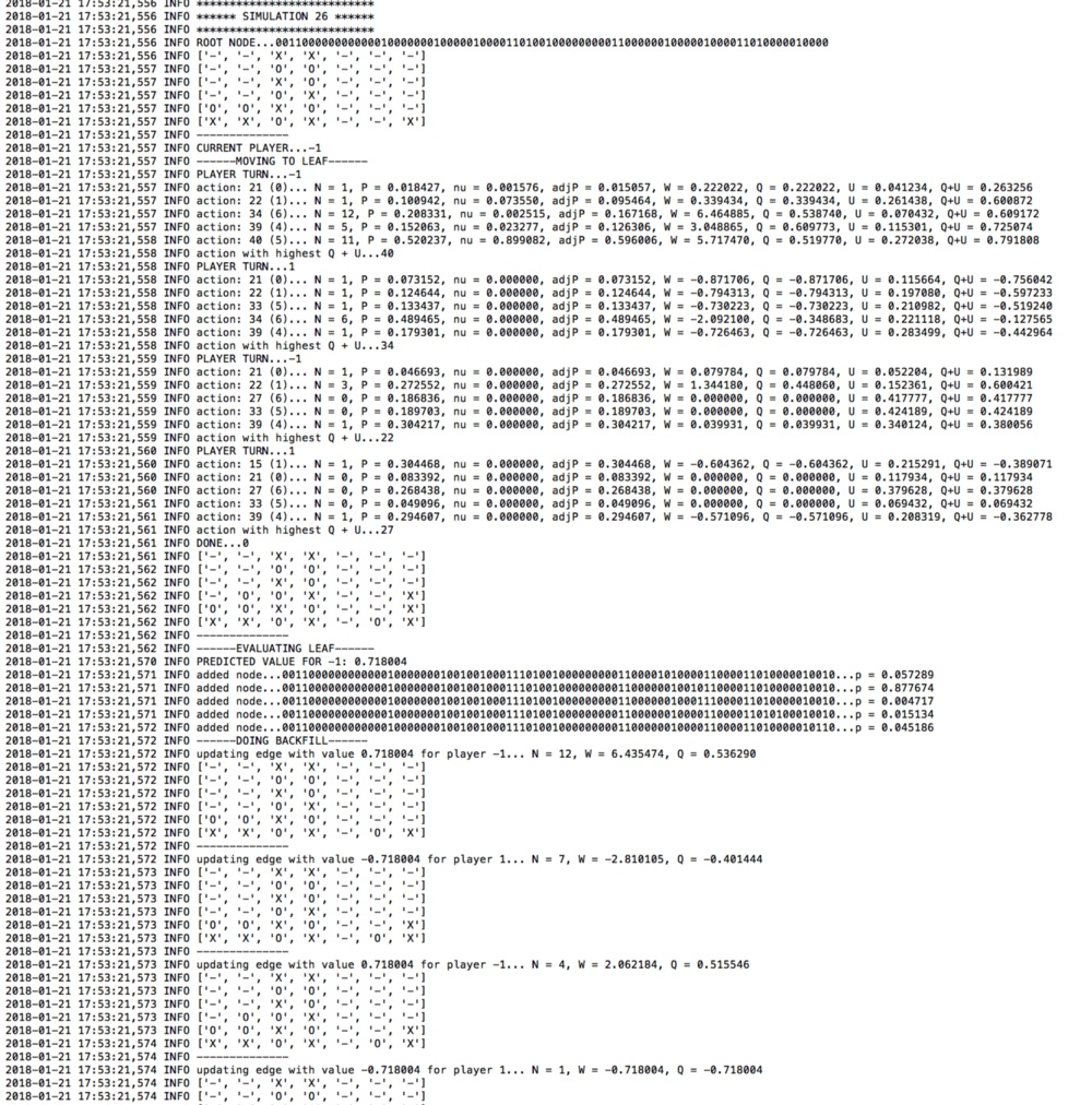 日志文件被保存到 run 文件夹中的 log 文件夹。要打开日志记录,可将该文件中 logger_disabled 变量的值设置为“False”。查看日志文件将帮助你了解算法的工作原理,并了解它的“思想”。例如,下面是 logger.mcts 文件中的一个样例: