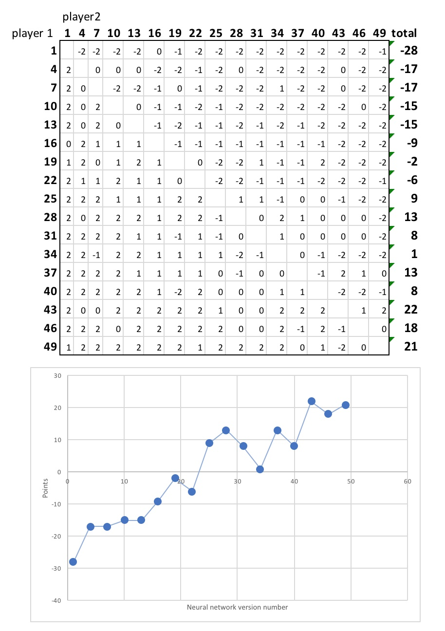 显然,后期版本的神经网络优于早期版本,赢得了它们之间的大部分比赛。另外,学习似乎并没有达到饱和,因为随着训练时间增加,玩家变得越来越强大,并且学习的策略越来越复杂。