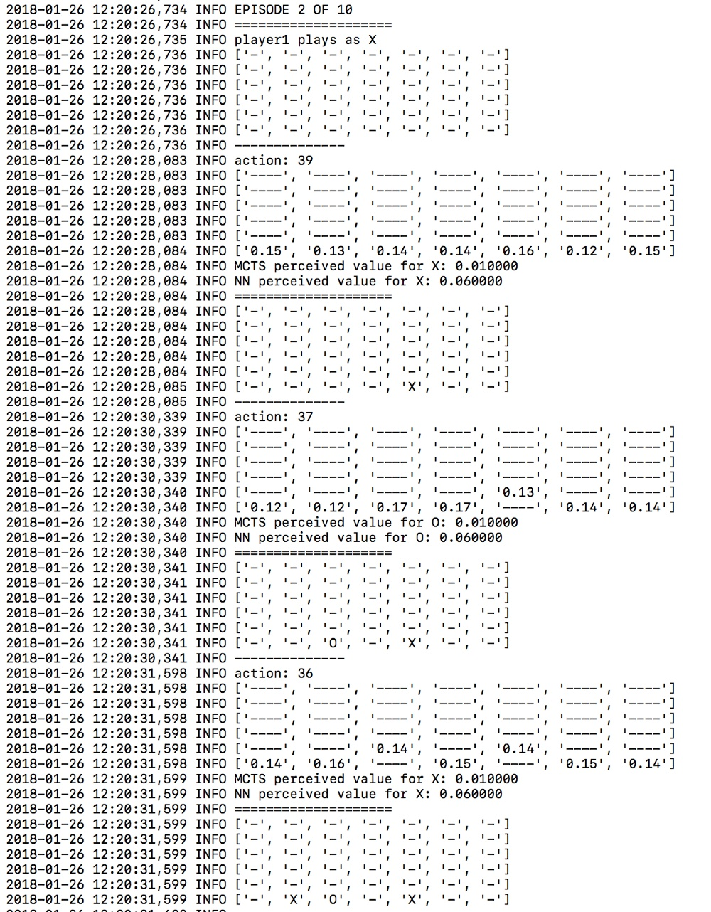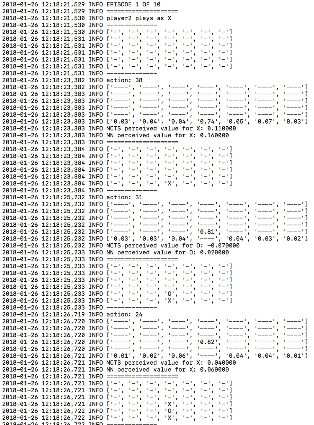 要开始学习过程,首先在 run.ipynb Jupyter notebook 中运行前两个面板。一旦它创建了足够的博弈情景,神经网络就开始训练了。