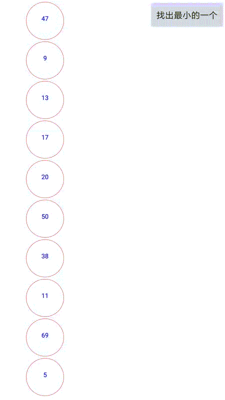 下面展示的是通过一个Android的程序来实现的直接选择排序的一个变化过程(数据随机生成 ,蓝色圆圈代表选中的最小,黑色代码排序好的,红色代表未排序的)