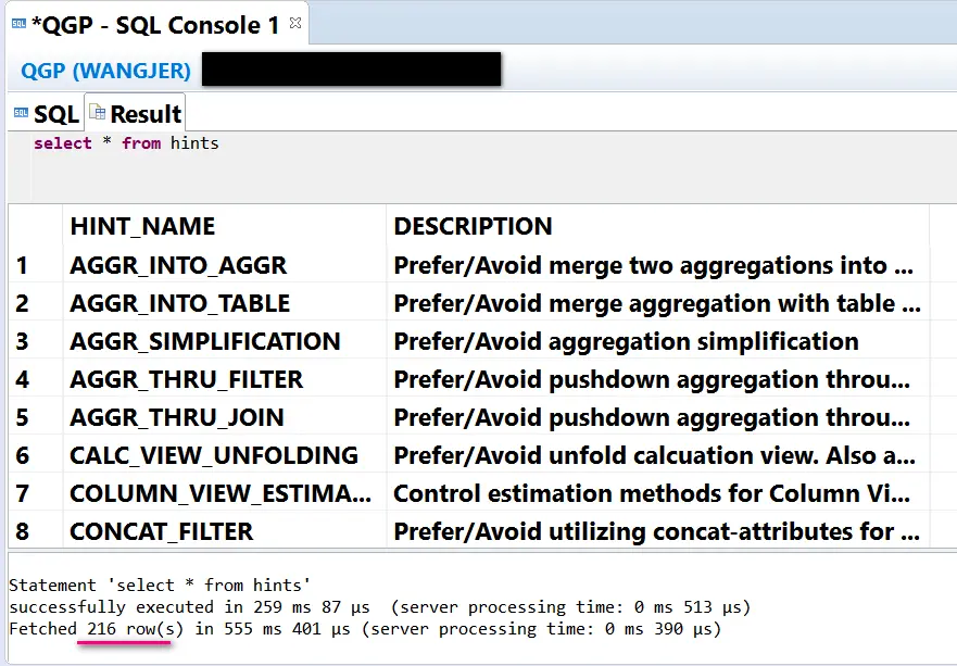 直接用于HANA Studio的SQL语句里。通过select * from hints能够拿到当前版本的HANA支持的所有Hint. 在我用的HANA服务器上总共216个: