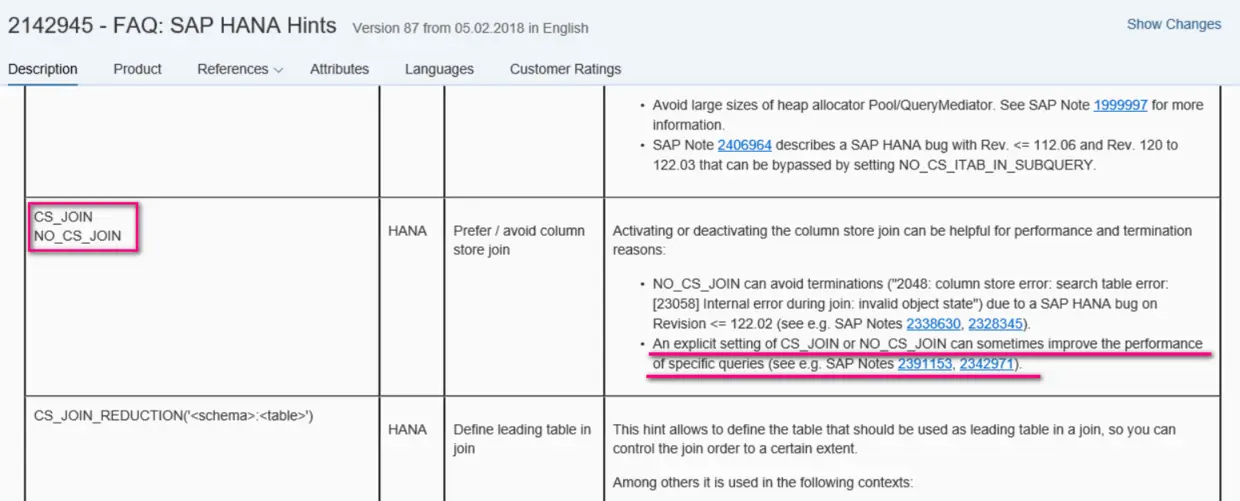 最极端的例子就是这对互斥的Hint: CS_JOIN 和NO_CS_JOIN, 它们分别用于建议HANA数据库采用或者不采用Column Store Join来响应数据请求。