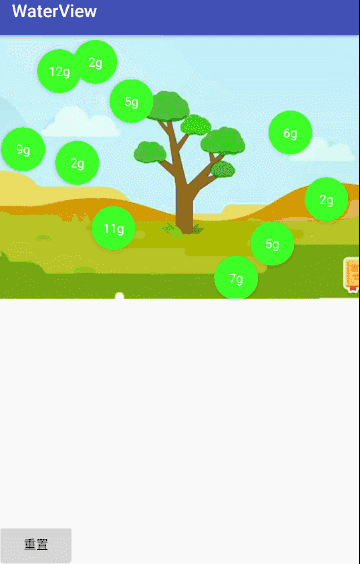 创建view最重要的两件事情: 1、给view一个随机的方向并且保存到view的tag里 //随机设置view动画的方向 view.setTag(R.string.isUp, mRandom.nextBoolean()); 2、随机设置view的位置(我这里并非完全随机,而是给了一些值,然后随机选择这些值)、这里用了一个新的集合保存已经选择到的数,下次选择的时候排除这些值,因为最好水滴不要完全重合嘛。/**但是其实这不是我最终的方法,先往下看吧,还有彩蛋**/ /** * 获取x轴或是y轴上的随机值 * * @return */ private double getX_YRandom(List<Float> choseRandoms,List<Float> saveRandoms) { float random = 0; while (random == 0 || saveRandoms.contains(random)) { random = choseRandoms.get(mRandom.nextInt(choseRandoms.size())); } saveRandoms.add(random); return random; }