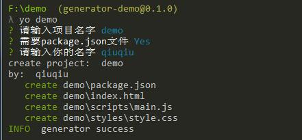 在确定本地已经安装yo工具(npm install -g yo)后,在你需要初始化demo项目的地方运行yo demo,等命令执行完毕,就可以看到新建的项目了。
