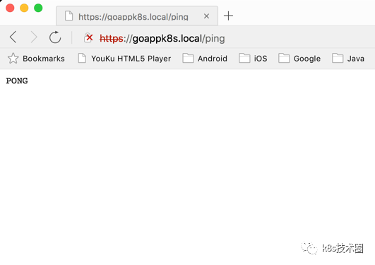 然后我们在浏览器中访问链接http://goappk8s.local/ping,可以看到页面上已经打印出来PONG。