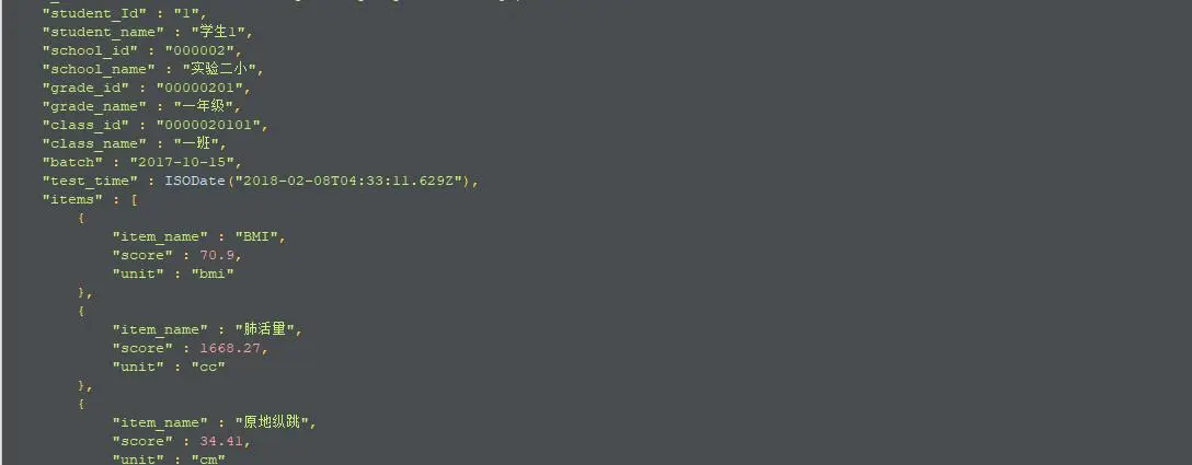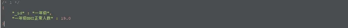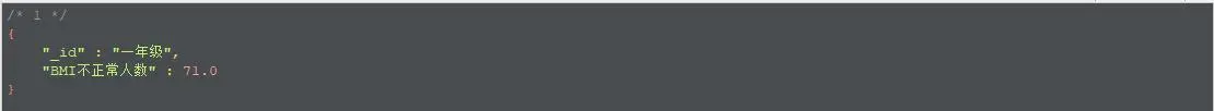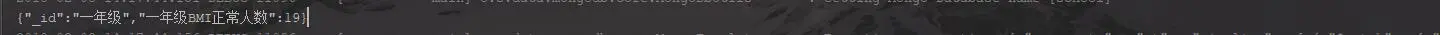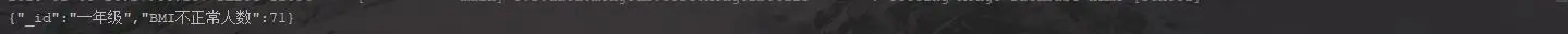Aggregation aggregation4 = Aggregation.newAggregation( Aggregation.unwind("items"), Aggregation.match(Criteria.where("items.item_name").is("BMI").and("items.score").gt(60).lt(70)), Aggregation.group("grade_name").count().as("BMI正常人数")); AggregationResults<BasicDBObject> outputTypeCount4 = mongoTemplate.aggregate(aggregation4, "pt", BasicDBObject.class); for (Iterator<BasicDBObject> iterator = outputTypeCount4.iterator(); iterator.hasNext(); ) { DBObject obj = iterator.next(); System.out.println(JSON.toJSONString(obj)); }结果: