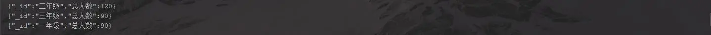 Aggregation aggregation1 = Aggregation.newAggregation(Aggregation.group("grade_name").count().as("总人数")); AggregationResults<BasicDBObject> outputTypeCount1 = mongoTemplate.aggregate(aggregation1, "pt", BasicDBObject.class); for (Iterator<BasicDBObject> iterator = outputTypeCount1.iterator(); iterator.hasNext(); ) { DBObject obj = iterator.next(); System.out.println(JSON.toJSONString(obj)); }结果: