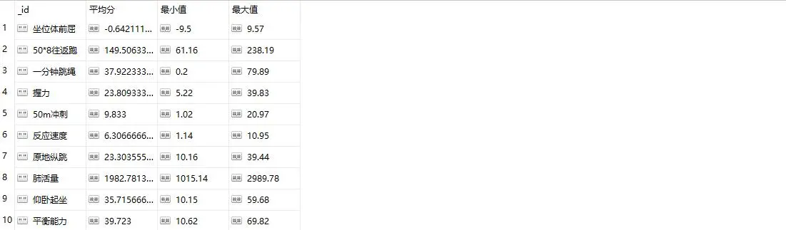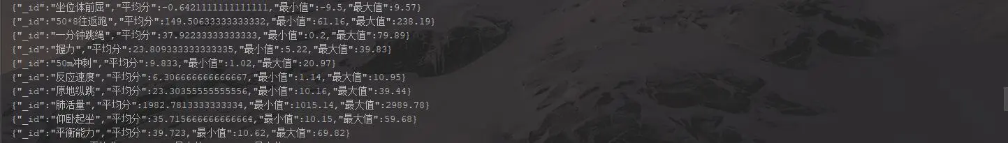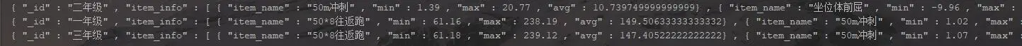 Aggregation aggregation5 = Aggregation.newAggregation( Aggregation.match(Criteria.where("grade_name").is("一年级")), Aggregation.unwind("items"), Aggregation.group("$items.item_name").avg("$items.score").as("平均分").min("$items.score").as ("最小值").max("$items.score").as("最大值")); AggregationResults<BasicDBObject> outputTypeCount5 = mongoTemplate.aggregate(aggregation5, "pt", BasicDBObject.class); for (Iterator<BasicDBObject> iterator = outputTypeCount5.iterator(); iterator.hasNext(); ) { DBObject obj = iterator.next(); System.out.println(JSON.toJSONString(obj)); }使用原生语句的写法: