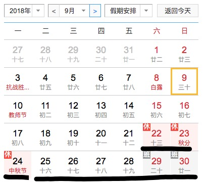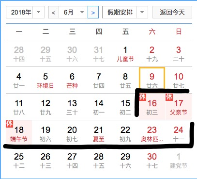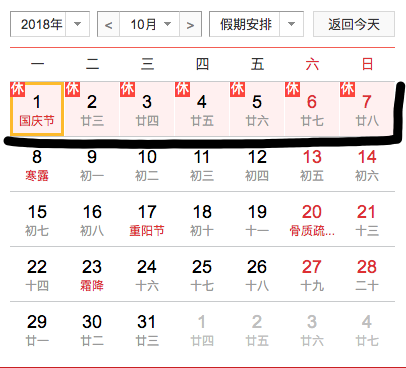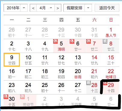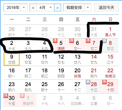 2018拼假指南 大不不 2018-02-09 192 阅读1分钟 前言快要放假了,过年之后就开始计划出去玩,结合2018假期安排,做了一个简单的拼假指南。假期安排清明节4月2日--4月4日,请3天假,可以连成8天长假五一劳动节5月2日--4月4日,请3天假,可以连成8天长假端午节6月19日--6月22日,请4天假,可以连成9天长假国庆假期9月25日--9月30日,请6天假,可以连成16天超长假期最后祝大家玩得开心O(∩_∩)O~~