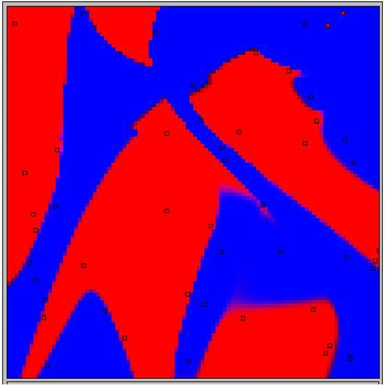 该算法为了让应用程序得到的错误评级比较低,它仅需要保证蓝色数据点位于蓝色区域,而红色数据点位于红色区域。其他所有像素点都是基于已知像素点的“猜测”。但由于这样已知的数据非常少,所以神经网络很难真正猜到这两个区域之间的边界到底在哪里。