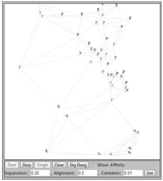 在这个区域中不存在任何随机性。除了粒子最初出现的位置是随机的之外,不会产生更多的随机数。你甚至可以点击“Big Bang”(大爆炸模式)按钮,来消除系统中所有的随机性。如果你点击了“Big Bang”按钮,则所有的粒子都会被放置到区域的中心位置,并以同样的方向运动。如此一来,要形成一幅复杂的运动模式并不会花费很长时间。所以对于用非常简单的规则来实现非常复杂的系统来说,蜂拥算法是一个非常典型的例子。