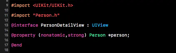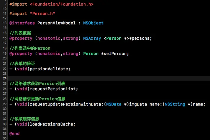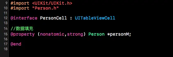 #import < Foundation/Foundation.h > @interface Person : NSObject //id @property (nonatomic,copy) NSString *pId; //姓名 @property (nonatomic,copy) NSString *name; @end写到这里就差不多了,M层只关心数据的结构。