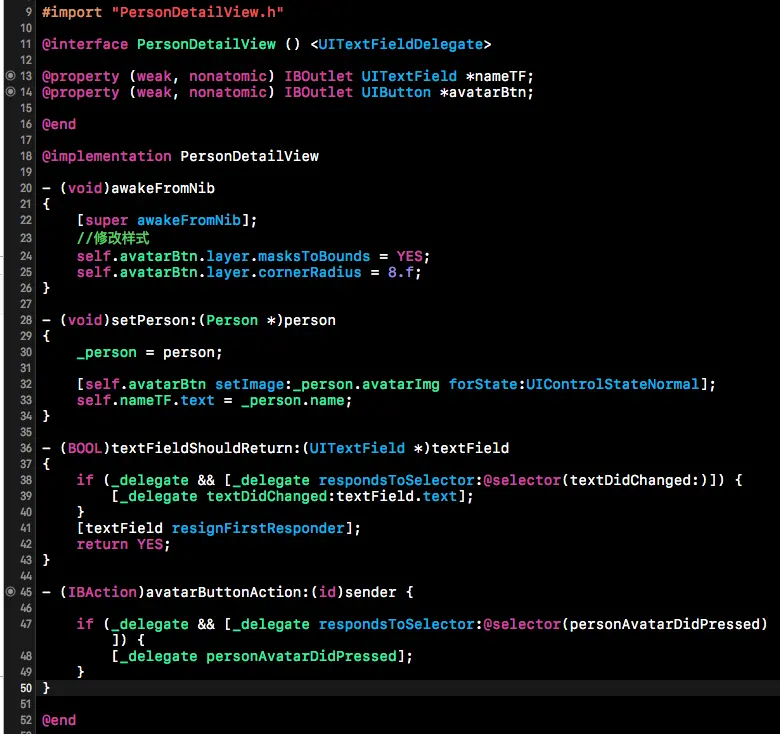 在.m中我们的思路是一样的,可以在View初始化时修改样式,利用setter方法赋值,以及一些控件的delegate,Action处理