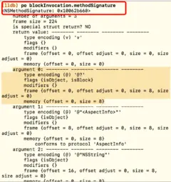 打印 blockInvocation 的方法签名,发现参数下标为 1 类型 并不是 selector ,而是 id< AspectInfo >