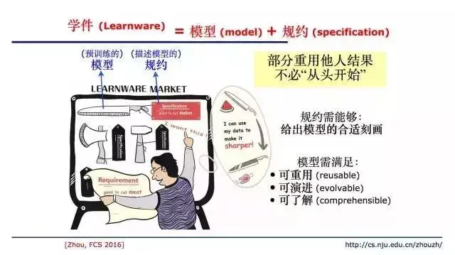 为了达到这个目的,「学件」应由两部分组成,一部分是模型,一部分是用于描述模型的规约(specification)。为了做到这件事情,模型需要有三个重要的特征,规约也需要达到他自己的性能。如果学件真正变成一个现实的话,可能刚才提到的这些问题都可以得到全面的解决。比如说,因为它本身是可以演进的,所以自己能适应环境;它本身有规约,不再是黑箱;用户可以把别人的模型作为基础,更容易得到专家级的性能。分享的是模型而不是分享数据,就避免了数据隐私和数据保护之类的问题。因此,如果学件能成为现实,可以有很多模型放在这个市场里,模型被更多的人用、用得更好,就可以有更高的定价。这样甚至有可能产生出一个新的产业。我们期望,经过十到十五年的探索以后,也许机器学习可以从「算法加数据」的形态过渡到「学件」的形态。