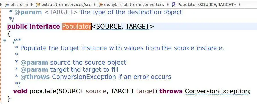 关于Populator的实际例子, 我们可以看看ProductUrlPopulator这个类, 它是接口Populator的一个具体实现类, 位于packagede.hybris.platform.commercefacades.product.converters.populator下面。从这个package下面我们也能发现很多其他的Populator,这也解释了本文Converter章节里介绍的为什么Populator属性注入的类型需要选择为List。