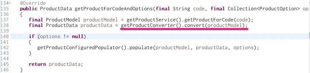 之前我们介绍了DTO(productData)是由第138行的convert方法生成的。这个方法的调用者是getProductConverter方法返回的一个Converter的实例,该实例实际上是Spring框架帮我们注入的一个Bean。对Bean这个概念不熟悉的朋友可以用关键字"Spring Bean"在百度或者Google上搜索。