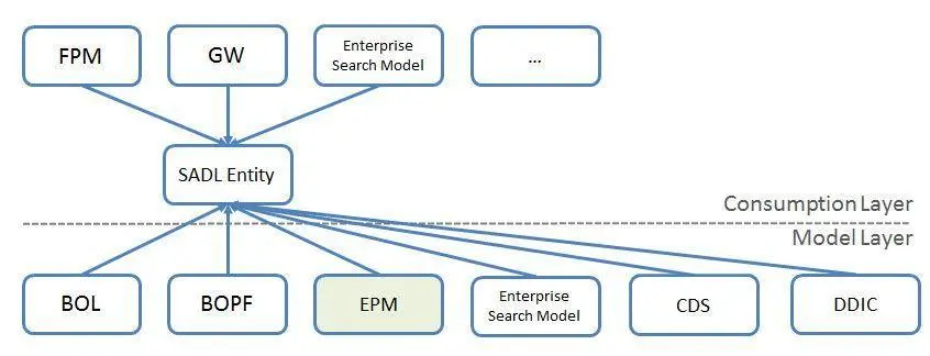 SAP把底层模型层(Model Layer)和上层消费层(Consumption Layer)之间的存储及解析映射关系模型的这一中间层称为SADL(Service Adaptation Definition Layer, L在有的上下文里也称为Language)。维护映射关系的模型则成为SADL模型。如下图所示: