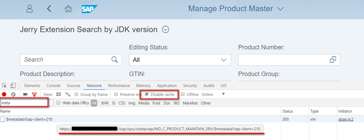 怎么找到这个url呢?重新打开你的Fiori应用,在Chrome development tool的Network tab里的filter输入框里,输入meta, 这样metadata请求的url就被显示出来了,如下图红色横线标注的url。