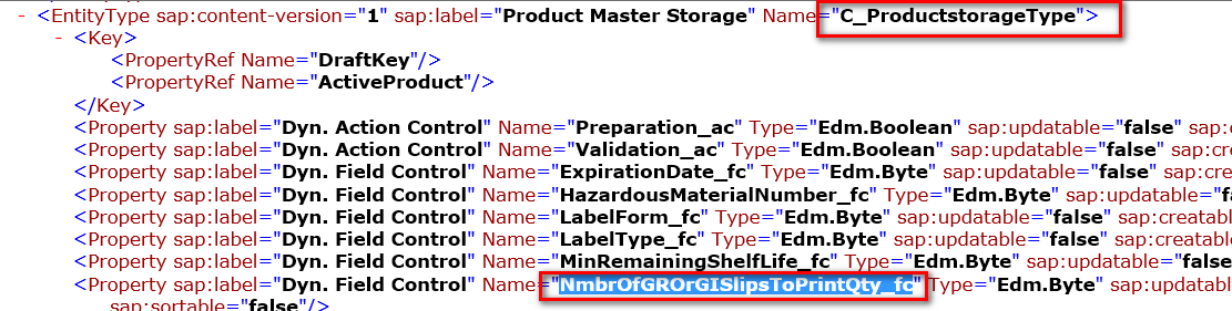 浏览器打开Open the metadata url之后,快捷键Ctrl+F, 输入第一步找到的模型字段的名称NmbrOfGROrGISlipsToPrintQty。这时就能找到该模型字段所属的Entity Type为C_ProductstorageType.