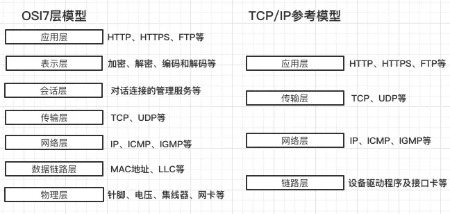 - 应用层:通常认为OSI模型的应用层、表示层、会话层在TCP/IP参考模型里是应用层。例如HTTP、HTTPS等。