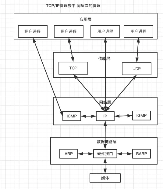 互联网协议族是一个网络通信模型,以及整个网络传输协议家族,为互联网的基础通信提供架构。TCP/IP参考模型分为四层,从上到下分别是:应用层、传输层、网络互连层、网络接口层。