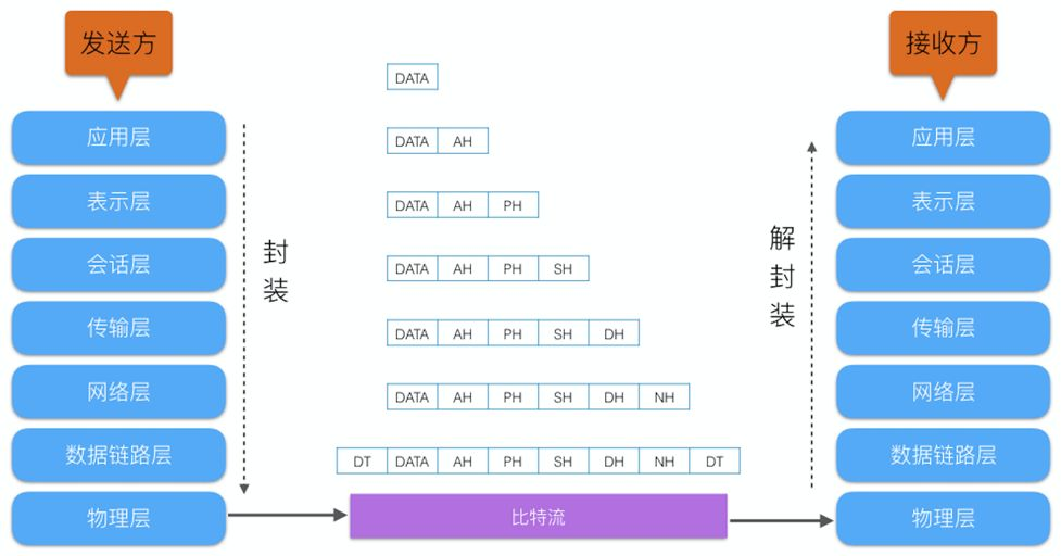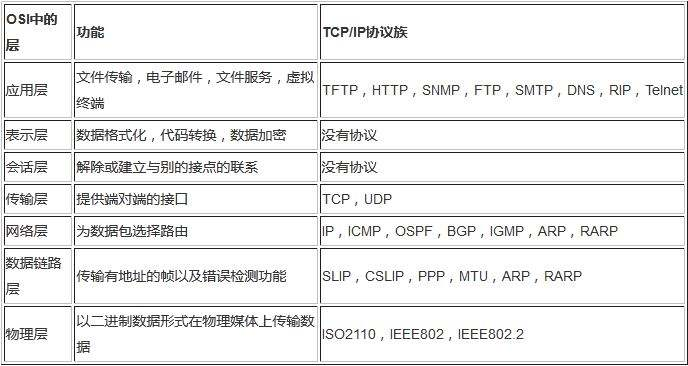 我们需要知道TCP工作在网络OSI的七层模型中的第四层——Transport层,IP在第三层——Network层,ARP 在第二层——Data Link层;在第二层上的数据,我们把它叫Frame,在第三层上的数据叫Packet,第四层的数 据叫Segment。 同时,我们需要简单的知道,数据从应用层发下来,会在每一层都会加上头部信息,进行 封装,然后再发送到数据接收端。这个基本的流程你需要知道,就是每个数据都会经过数据的封装和解封 装的过程。 在OSI七层模型中,每一层的作用和对应的协议如下: