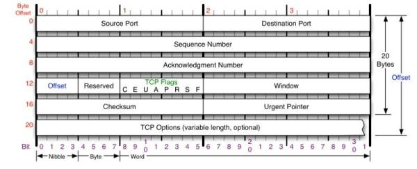 Offset:给出首部中32 bit字的数目,需要这个值是因为任选字段的长度是可变的。这个字段占4bit(最多能 表示15个32bit的的字,即4*15=60个字节的首部长度),因此TCP最多有60字节的首部。然而,没有任选字段, 正常的长度是20字节;