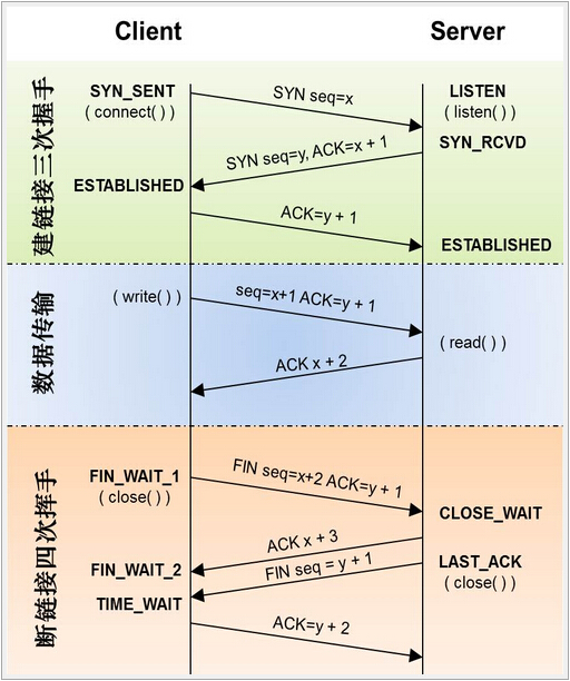 1.第一次握手:建立连接。客户端发送连接请求报文段,将SYN位置为1,Sequence Number为x;然后,客户端进入SYN_SEND状态,等待服务器的确认;