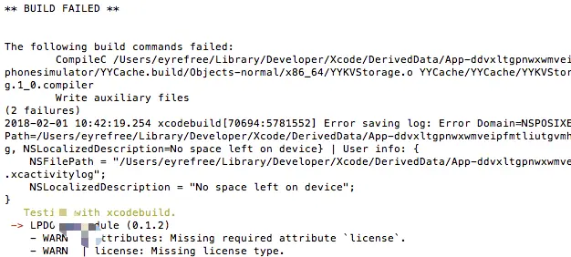 2018-02-01 10:42:19.254 xcodebuild[70694:5781552] Error saving log: Error Domain=NSPOSIXErrorDomain Code=28 "No space left on device" UserInfo={NSFilePath=/Users/eyrefree/Library/Developer/Xcode/DerivedData/App-ddvxltgpnwxwmveipfmtliutgvmh/Logs/Build/EAAA47AC-D38B-4A1C-9686-3F3DF1A40287.xcactivitylog, NSLocalizedDescription=No space left on device} | User info: {