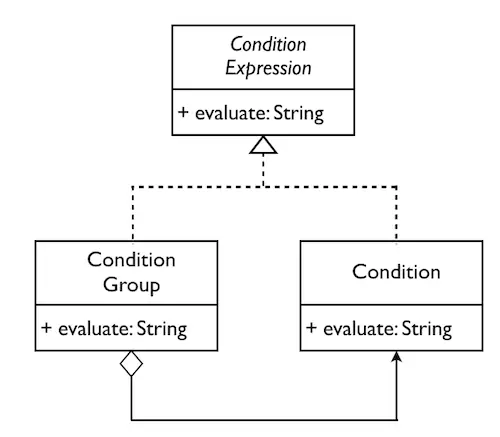 Group是表达式树的枝节点,而Condition则是表达式树的叶子节点。如下图所示,不恰好是Composite模式的体现么?