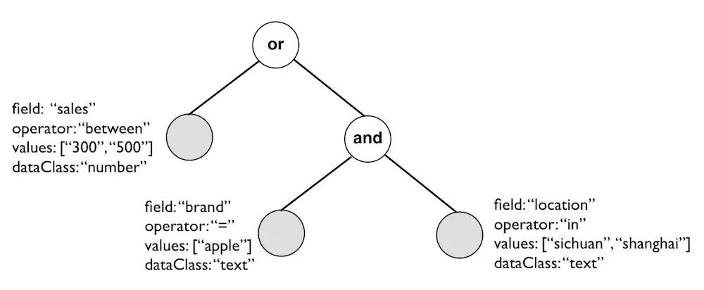对条件表达式树的验证主要是避免出现非法节点,例如不支持的操作符,不符合要求的条件值,不合理的递归嵌套,空节点等。若验证不通过则需要提供错误信息,并返回给前端400的BadRequest。解析时,必须保证节点是合规的,解析后的结果为满足SQL语法中where条件子句的字符串。
