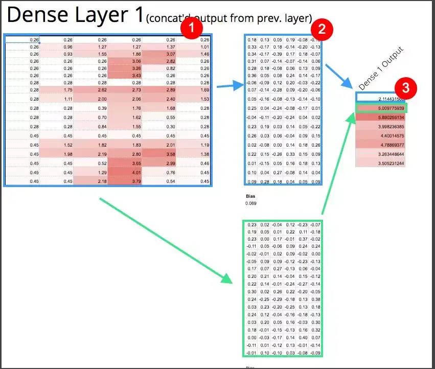 我用了一个非常著名的深度学习库 Keras,然后把我模型中训练好的权重放到表里。训练好的权重只是数字。把它们放到表格里就是说从模型里复制然后粘贴到表格里。最后一步是在表格里加上复制模型功能的公式,就用传统的加法、乘法等。让我再说一次:用来重现一个深度学习模型的数学就是乘法和加法。
