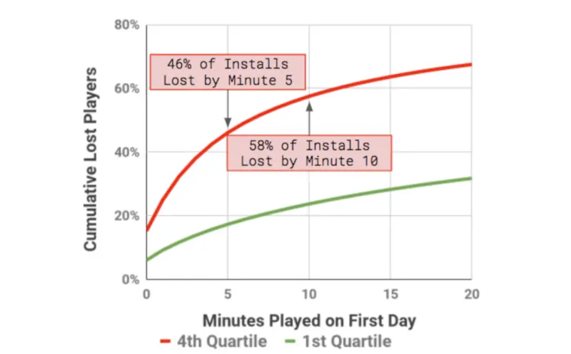 游戏的前几分钟是应用生命周期中的关键时刻。在这个时候,他们在游戏中的唯一投资就是下载它所花费的时间和精力。任何负面的经验都会导致玩家退出,或者转向另一个应用。