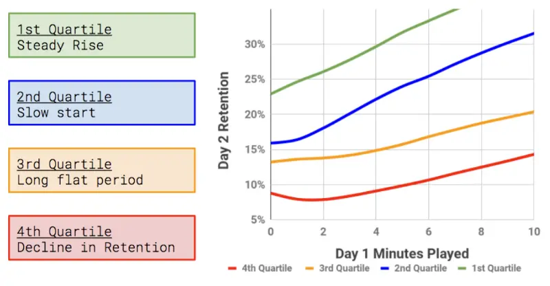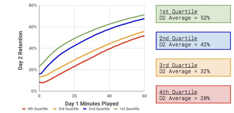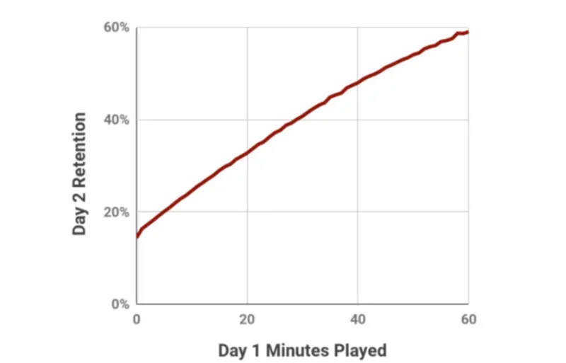此图显示新玩家在第一天玩的时间长度,和第二天留存的玩家的百分比。这个趋势表明第一天在游戏中花费的时间越长,他们继续玩下去的可能性就越大。