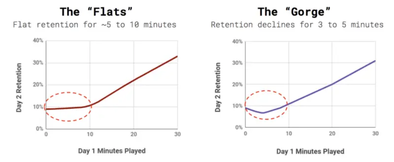 如果你在游戏中发现了“平地”或“峡谷”的反模式,或者在开始时的留存率太低,那么再看看可能导致它的原因。考虑二次下载、长负荷时间或其他因素是否会产生负面影响。如果你能将前十分钟内的不利于保留与任何特定因素联系起来,测试适度改变或消除原因,你应该看到你的游戏留存率、每日活跃用户以及最终收益的改善。
