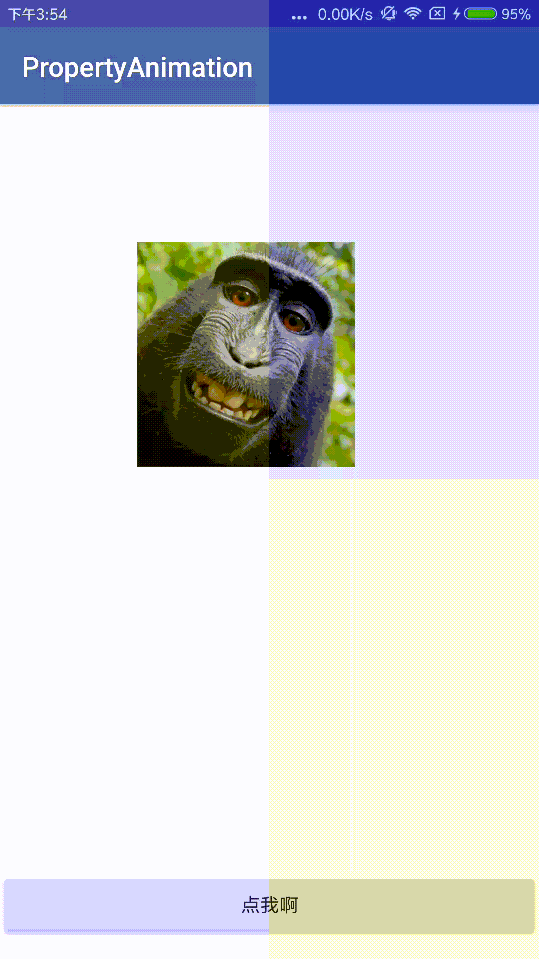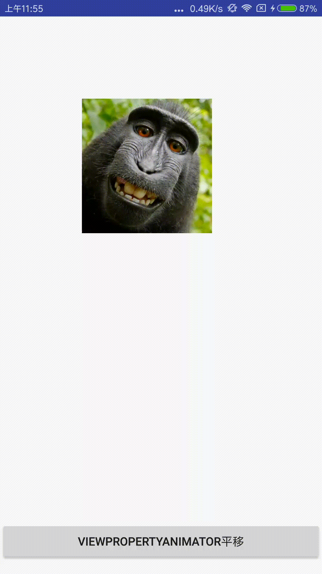 ViewPropertyAnimator 是属性动画中专门针对 view 的类,使用起来也很简单,一行代码基本可以搞定。因为简单,所以,我们从它开始。现在我们简单写个demo:布局很简单,一个图片一个按钮,点击按钮,图片执行动画。