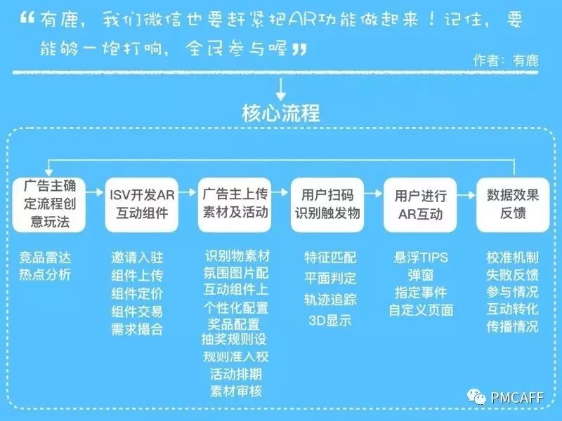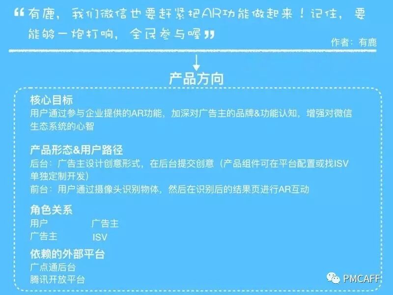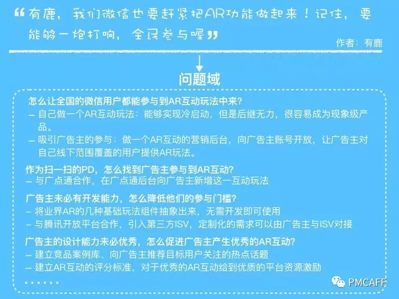 以微信AR的需求为例,根据问题域,我们发现需求不只是扫码组件增加AR识别能力这么简单,整个需求里需要引入广告主的角色,并且需要和广点通、腾讯开放平台等团队合作。最终得到的产品方向描述是这样的: