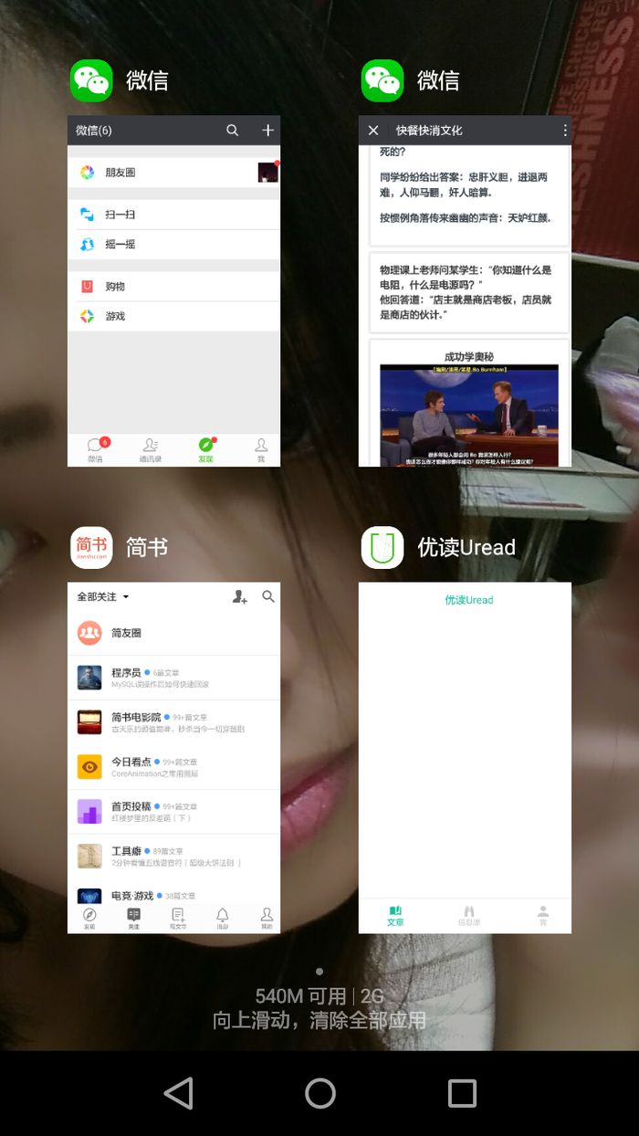 然后点击主页键返回手机桌面,接着点进微信去到回复你好友的消息,这个时候,按下那个之前你用来切换手机各个启动的APP软件的按钮,此时你应该能够成功的看到了两个微信的页签了(获取直接从 手机的通知栏进入和好友互动的聊天框,然后再按下那个APP之间的切换键也可以看到下图效果)