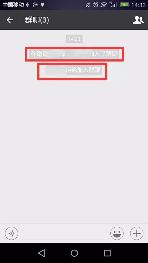 点击确定以后,群生成了,但是会发现:伪好友会有这此人“XXX拒绝加入群聊”标志语句,而正常的好友则是“XXX加入了群聊”,有拒绝标志语句的那个就是“伪好友”。