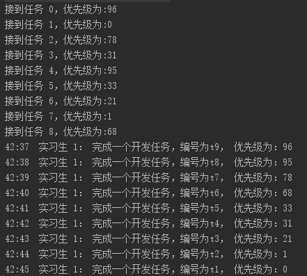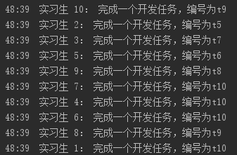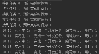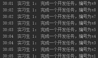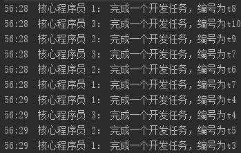 + " 完成一个开发任务,编号为t" + (taskSize--) + ", 用时:" + delay/1000