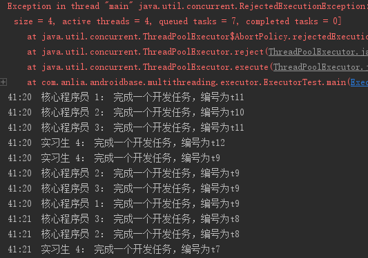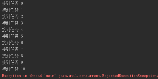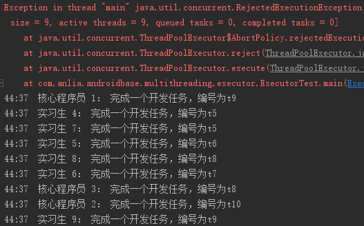 在招满人的情况下,公司最多就9个程序员,当接到第10个任务时,发现没人可用了,就会抛出异常。当然,之前成功接收的任务不会受到影响
