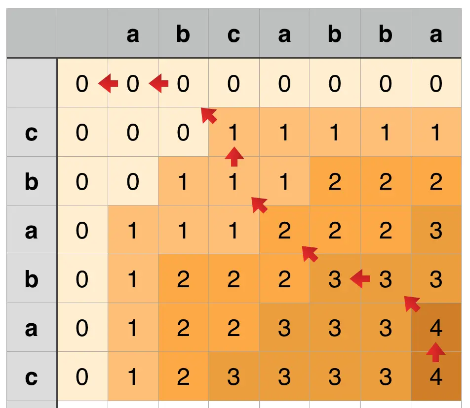- 两个字符串的LCS为"caba"(这是完成回溯后,通过观察红色箭头所形成的路径而得来;观察上图可知,回溯阶段时,每一次遇到需要向左上角移动的情况下,该坐标对应的字符串A内的某一字符与字符串B内的某一字符相同,即这个字符可以作为LCS的组成字符之一)