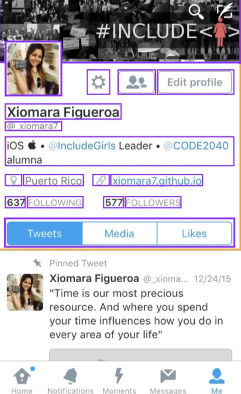 我们来仿写一个 Twitter iOS app 的个人信息视图。在下面的图片中,可以看到顶部视图包括一个 Banner 图,用户头像,以及用户信息。然后下方是所有推展示在列表中以及tabbar。所有的 UIView 元素都拿紫色标注了起来。接下来我们聚焦在 header view,橙色区域。