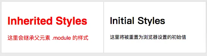 看到了吧?左边的所有属性都继承了其父元素 .module ,而另一边则通过 initial 关键字,被重置为浏览器默认的属性。